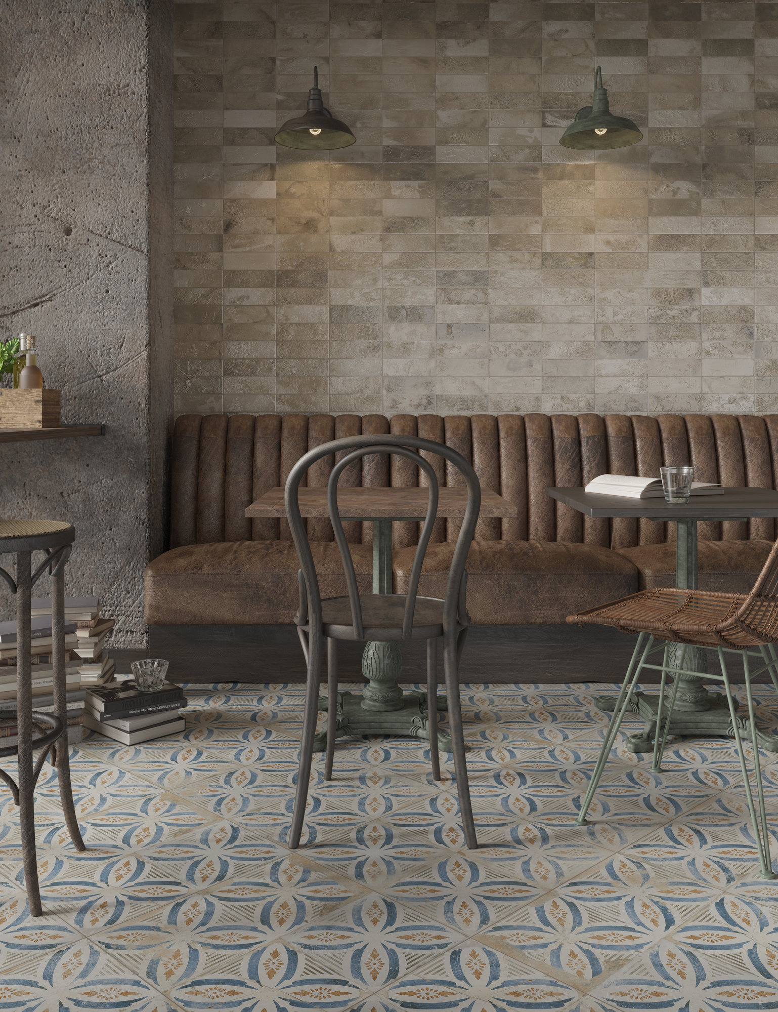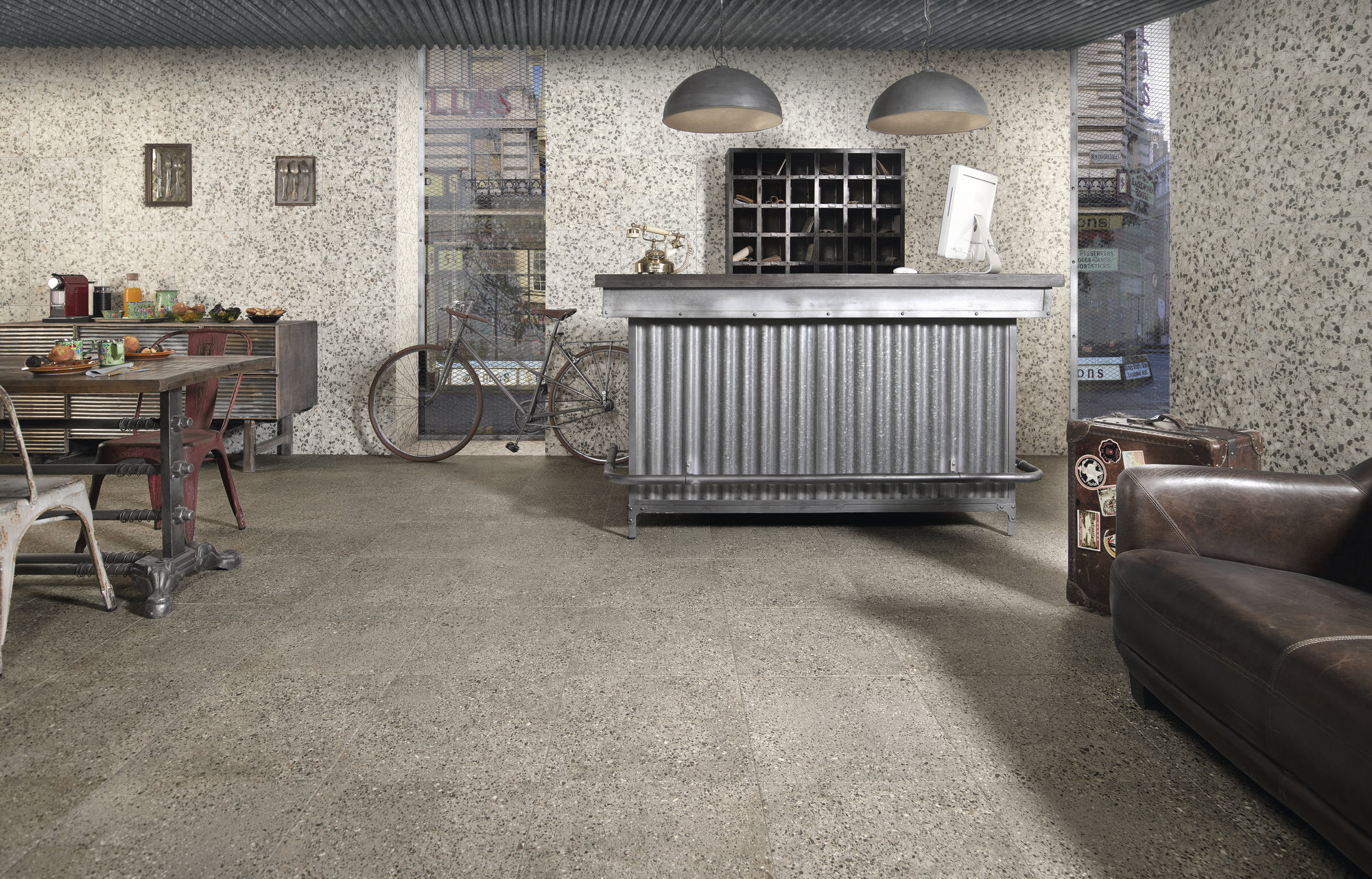 Fliesen in Terrazzo-Optik. Reminiszenz an die urbane Vergangenheit und Architektur von Städten wie New York, London oder Berlin.