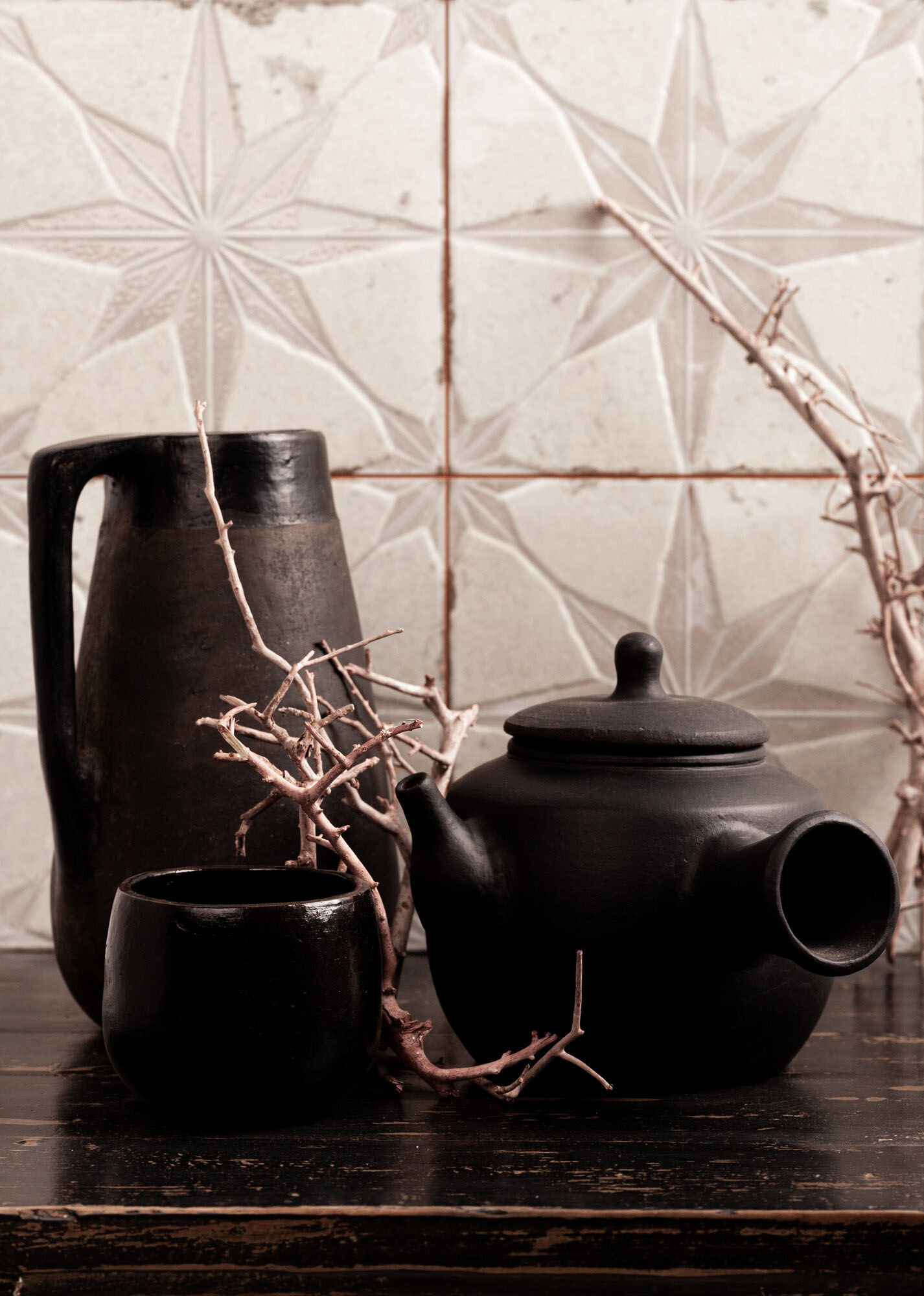 Raku, eine uralte Technik der Keramikherstellung. Bei Brenntemperatur kommen Fliesen aus dem Ofen auf Holzspäne. Der entstehende Schwelbrand erzeugt Russ, der in die Keramik eindringt und ihnen ihre ganz individuelle Textur verleiht. Diese Technik war Inspiration für diese Kollektion von Francisco Segarra.