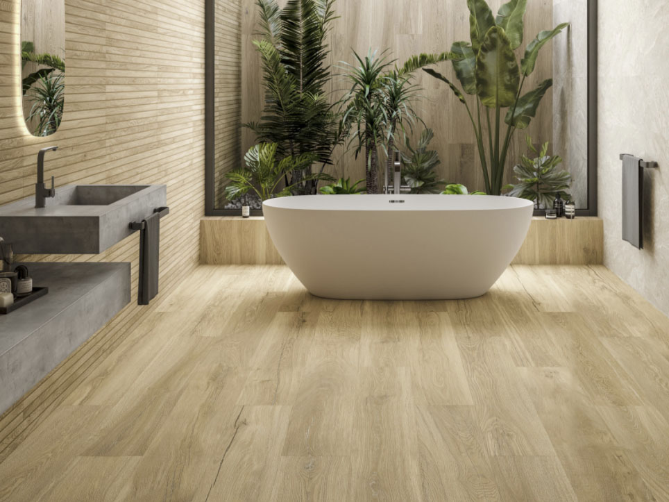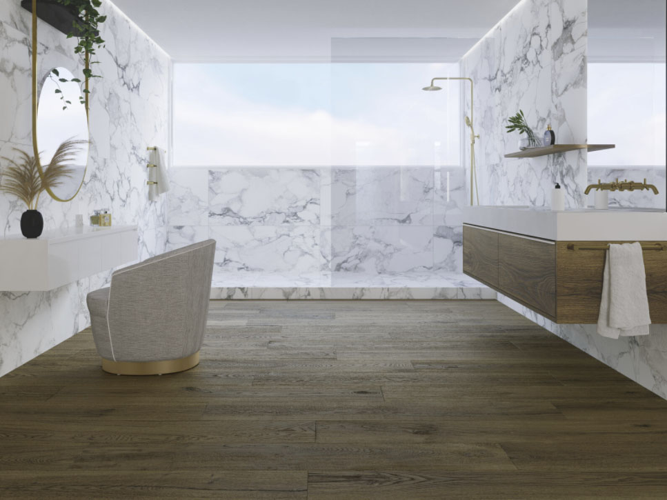 Grow übernimmt die natürliche Schönheit von natürlichem, charaktervollem Eichenholz. So findet der Charme von Holzböden auch Einzug in Bereiche wie das Bad und ist vom Original kaum zu unterscheiden.