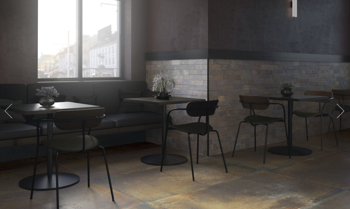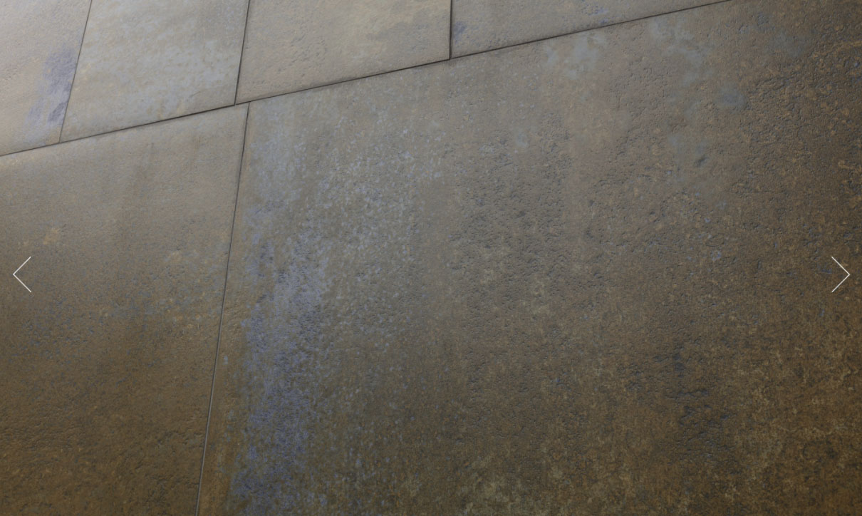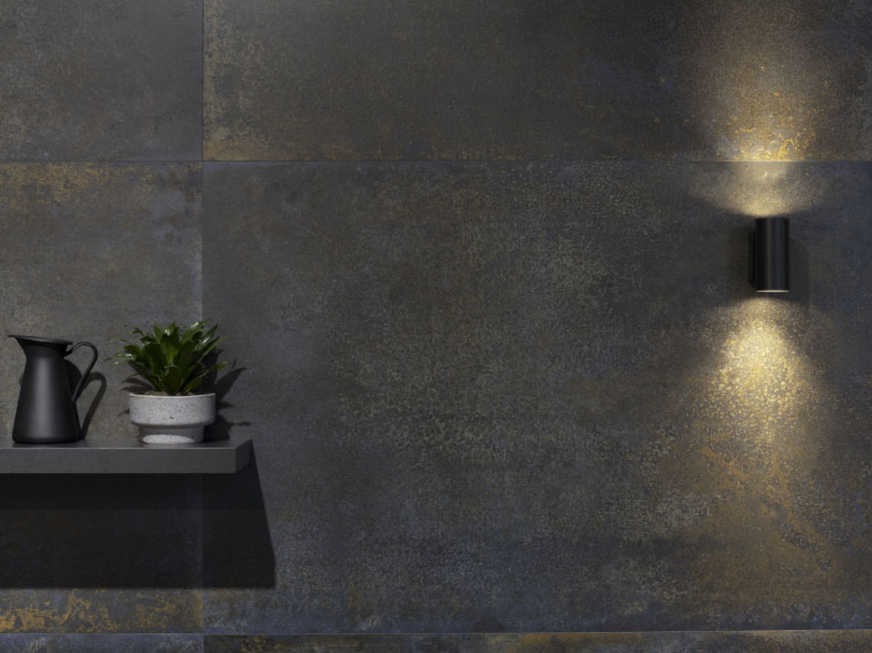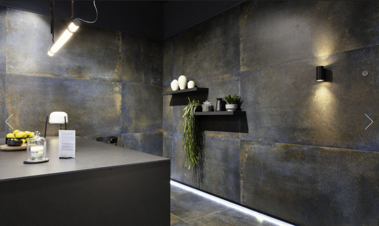 Ausdrucksstarke Fliesen in der Trend-Optik Cortenstahl, wobei die Rost-Optik durch die neue Technologie 4D Shaped verstärkt hervorgehoben wird.